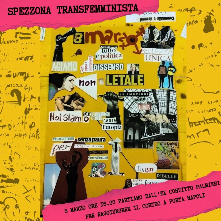 Oggi siamo qui per fare sentire la nostra voce, per non dimenticare e ricordare a tutte che la lotta che stiamo affrontando non ha mai smesso di essere urgente. Questa è una lotta di tutte le persone che si identificano come donne, come persone non binarie, come persone che vivono ogni giorno l’oppressione di chi cerca di limitare la nostra libertà. Oggi, siamo qui per dire che la lotta è transfemminista, e che le differenze si annullano quando si tratta di vivere le stesse discriminazioni nella vita quotidiana. La nostra lotta è una lotta per l’autodeterminazione, per la possibilità di scegliere liberamente chi vogliamo essere, come vogliamo vivere e chi vogliamo amare, senza paura e senza restrizioni.